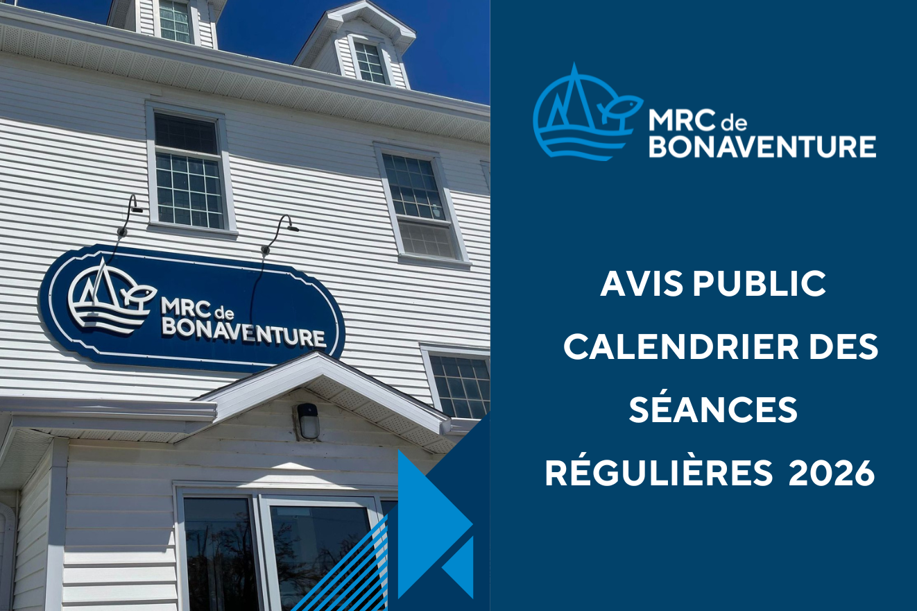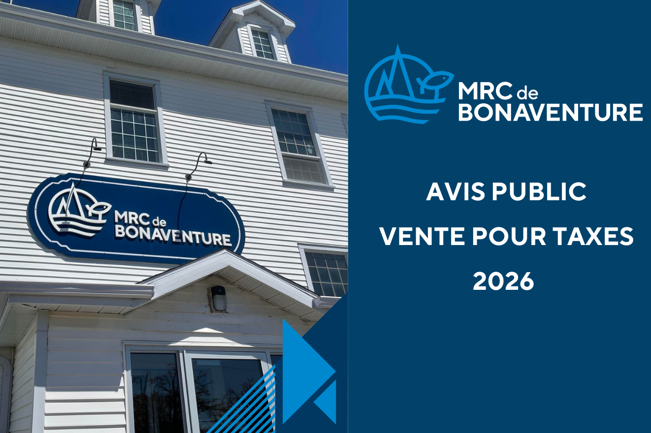 AVIS PUBLIC Vente pour taxes 2026 - MRC de Bonaventure _______________________________________________________________________________________________ AVIS PUBLIC vous est par la présente donné par le soussigné, François Bujold, directeur général et greffier-trésorier de la Municipalité Régionale de Comté de Bonaventure que les immeubles ci-après décrits seront vendus à l’enchère publique à la ...
