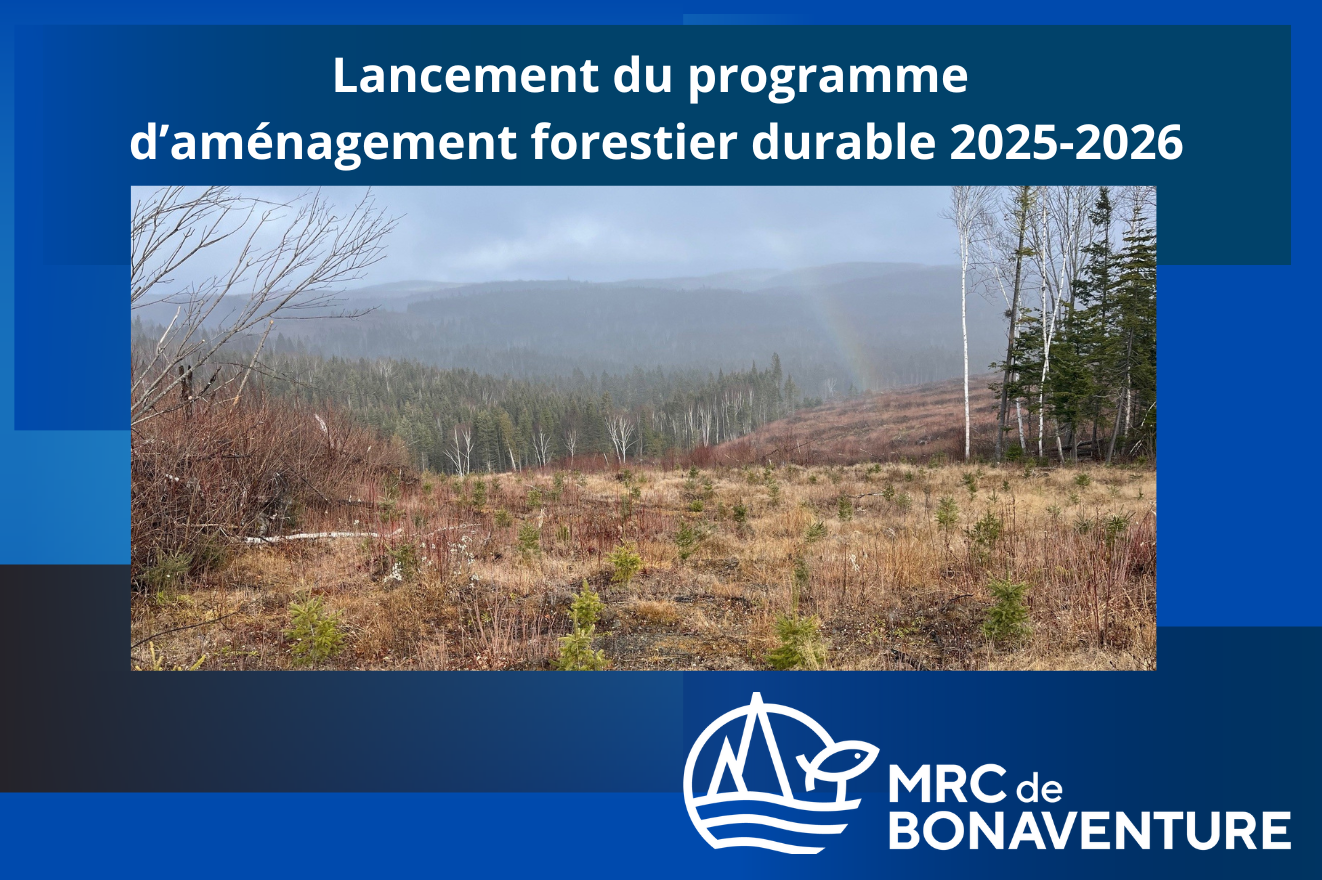 La MRC de Bonaventure est fière d’annoncer le lancement officiel du programme d’aménagement forestier durable du ministère des Ressources naturelles et des Forêts (MRNF) pour la saison 2025-2026, sur l’ensemble du territoire de la Gaspésie–Îles-de-la-Madeleine.